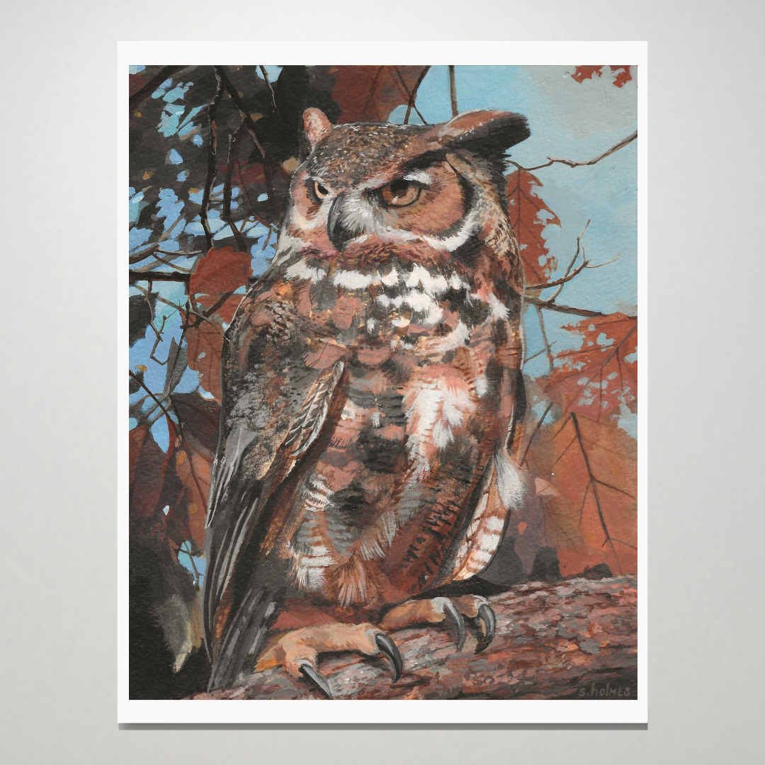 The late afternoon light warms Great Horned Owl’s face as he silently watches over the brush below. The feathers in his plumicorns or “horns” gently wave in the cold breeze. A lone twig snap is felt by his every sense.